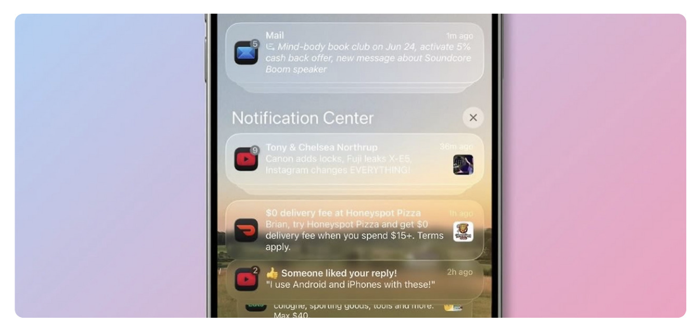 比如看郵件時(shí),如果郵件內(nèi)容是純文字,玻璃背景會(huì)盡量 “隱身”,只保留淡淡的分層;如果郵件里有表格或圖片,背景會(huì)自動(dòng)加強(qiáng)模糊,讓表格的邊框更清晰;就連收到推送時(shí),通知欄的玻璃界面會(huì)比背景亮一點(diǎn),既能提醒我 “有新消息”,又不會(huì)像扁平時(shí)代的彈窗那樣 “擋視線”。