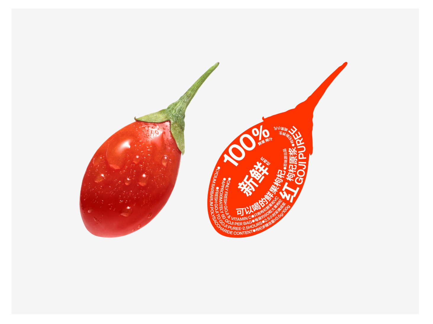 文字排版完全服務于視覺邏輯與產(chǎn)品賣點。“果小凡” 品牌名、“100% 冷萃”“枸杞原漿” 等關鍵信息,緊貼枸杞果實的輪廓排布,既形成了飽滿的視覺結(jié)構(gòu),又讓文字與圖形融為一體,不顯得突兀。同時,核心賣點如 “原花青素 120 毫克 / 100mL”“常溫保鮮專利” 等,以簡潔的字體呈現(xiàn),沒有多余修飾,讓消費者快速抓取關鍵價值點。