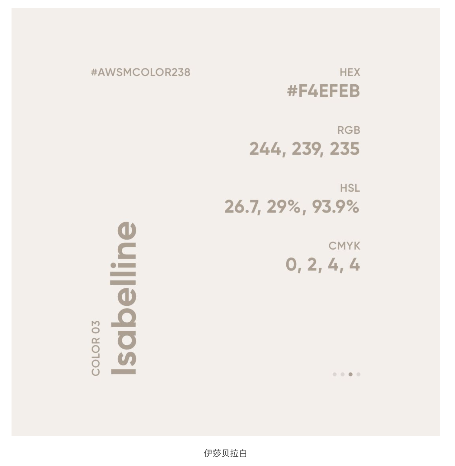 色值 #F4EFEB 的伊莎貝拉白,是介于灰白與淺米色之間的暖調(diào)白色,低飽和度的特質(zhì)讓它自帶一種歲月沉淀的溫潤感。這種顏色的名字源于一個(gè)充滿獵奇色彩的傳說:17 世紀(jì)初,哈布斯堡王朝的伊莎貝拉公主為等待出征的丈夫凱旋,發(fā)誓三年內(nèi)不換洗內(nèi)衣,最終衣物形成的色調(diào)被稱為 “伊莎貝拉白”。